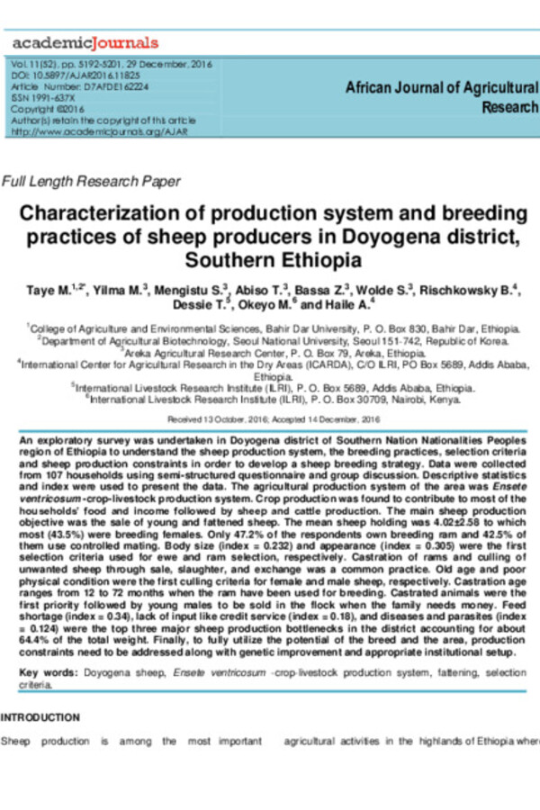 Characterization of production system and breeding practices of sheep producers in Doyogena district, Southern Ethiopia