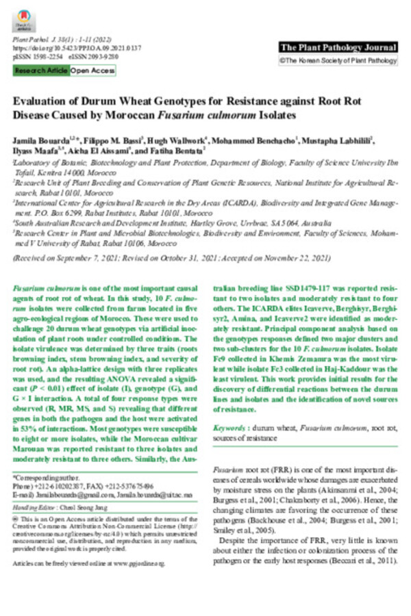 Evaluation of Durum Wheat Genotypes for Resistance against Root Rot Disease Caused by Moroccan Fusarium culmorum Isolates