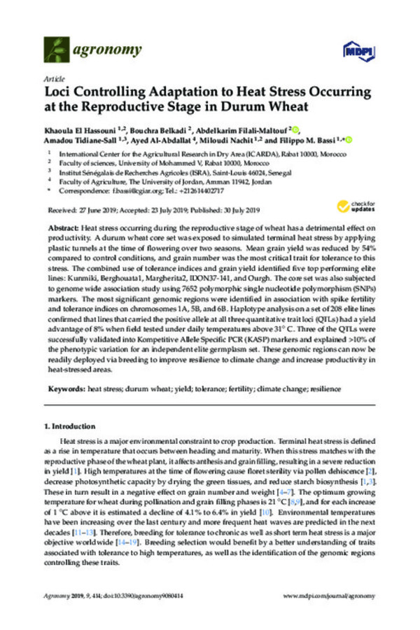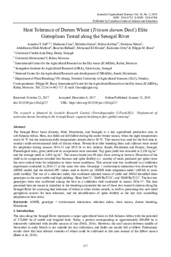 Heat Tolerance of Durum Wheat (Tritcum durum Desf.) Elite Germplasm Tested along the Senegal River