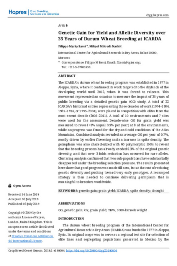 Genetic Gain for Yield and Allelic Diversity over 35 Years of Durum Wheat Breeding at ICARDA