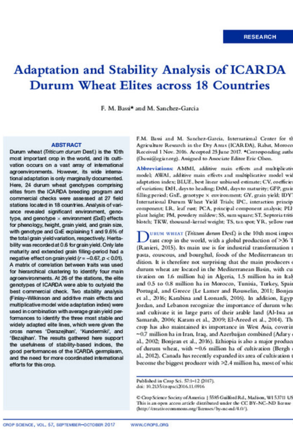 Adaptation and Stability Analysis of ICARDA Durum Wheat Elites across 18 Countries