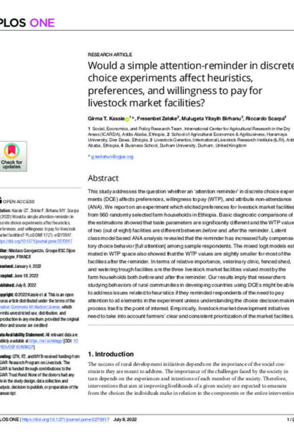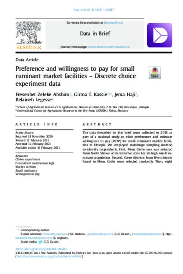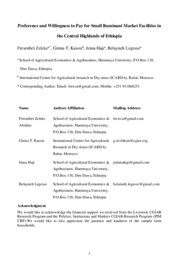 Preference and Willingness to Pay for Small Ruminant Market Facilities in the Central Highlands of Ethiopia