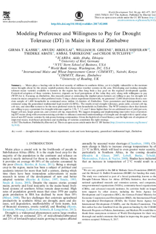 Modeling Preference and Willingness to Pay for Drought Tolerance (DT) in Maize in Rural Zimbabwe