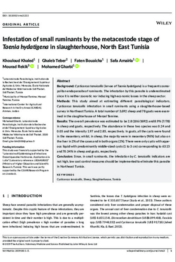 Infestation of small ruminants by the metacestode stage of Taenia hydatigena in slaughterhouse, North East Tunisia