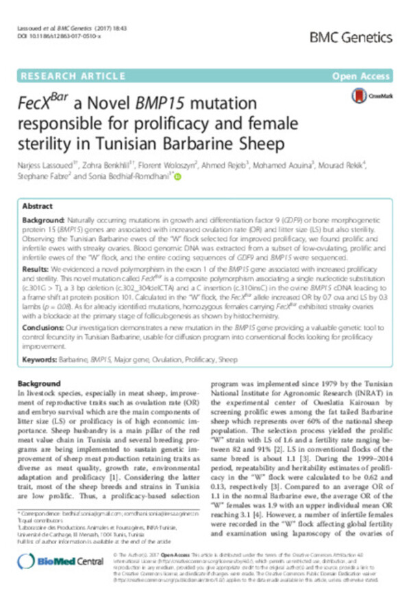 FecXBar a Novel BMP15 mutation responsible for prolificacy and female sterility in Tunisian Barbarine Sheep