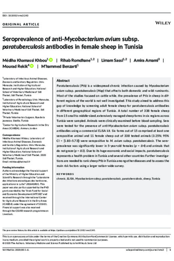Seroprevalence of anti‐Mycobacterium avium subsp. paratuberculosis antibodies in female sheep in Tunisia