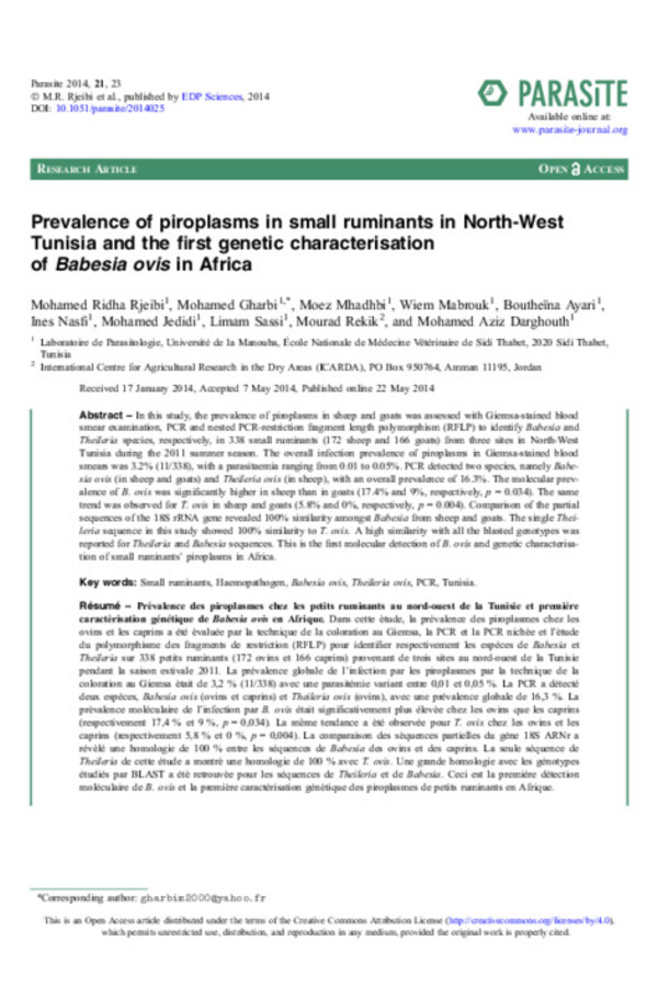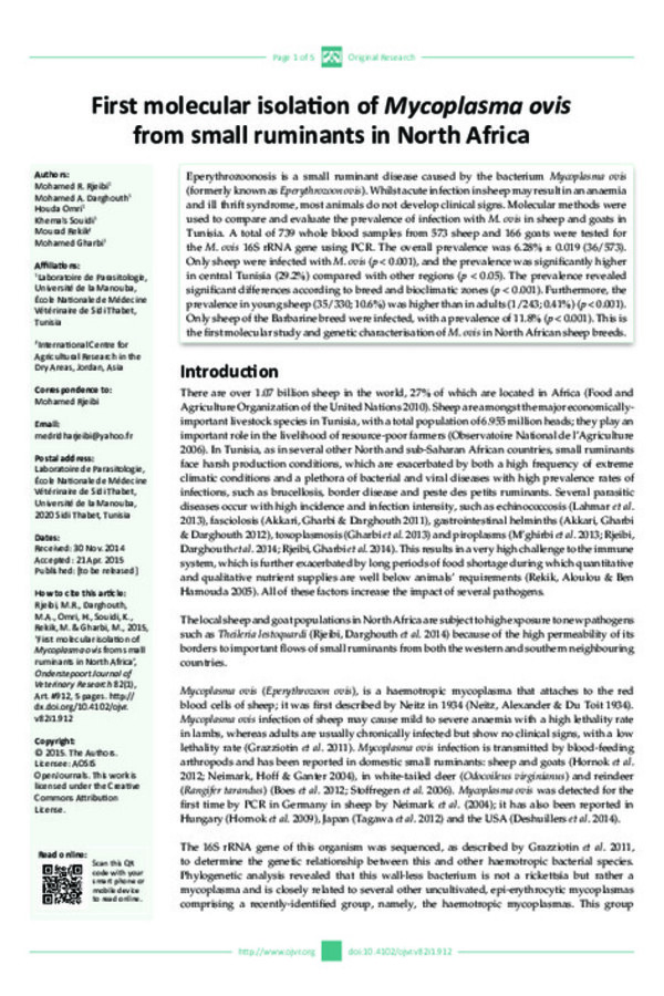 First molecular isolation of Mycoplasma ovis from small ruminants in North Africa