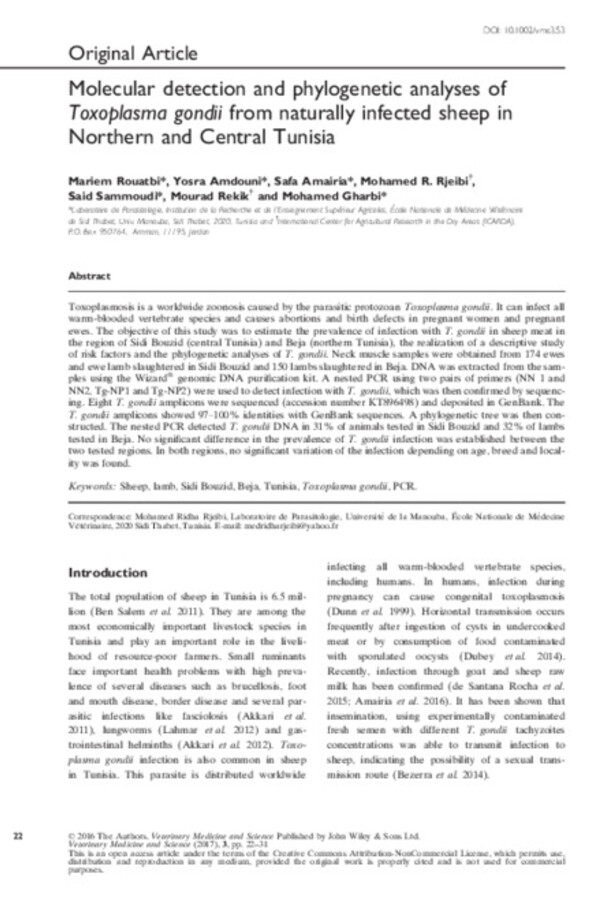 Molecular detection and phylogenetic analyses of Toxoplasma gondii from naturally infected sheep in Northern and Central Tunisia
