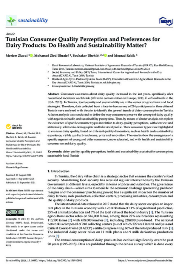 Tunisian Consumer Quality Perception and Preferences for Dairy Products: Do Health and Sustainability Matter?