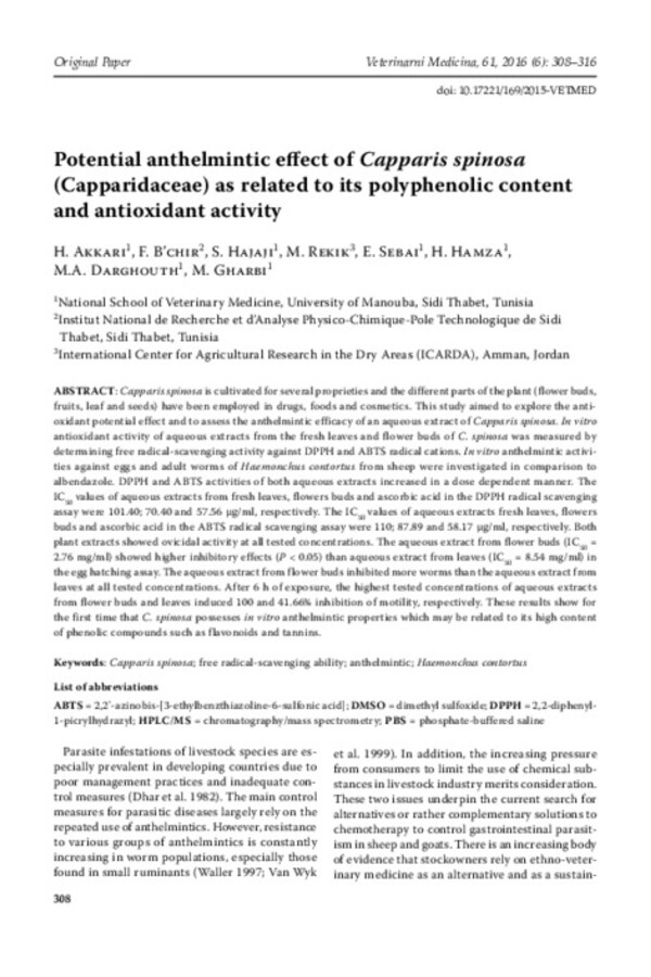Potential anthelmintic effect of Capparis spinosa (Capparidaceae) as related to its polyphenolic content and antioxidant activity