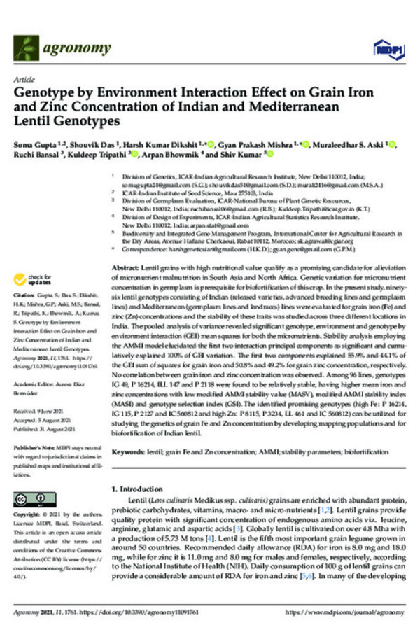 Genotype by Environment Interaction Effect on Grain Iron and Zinc Concentration of Indian and Mediterranean Lentil Genotypes
