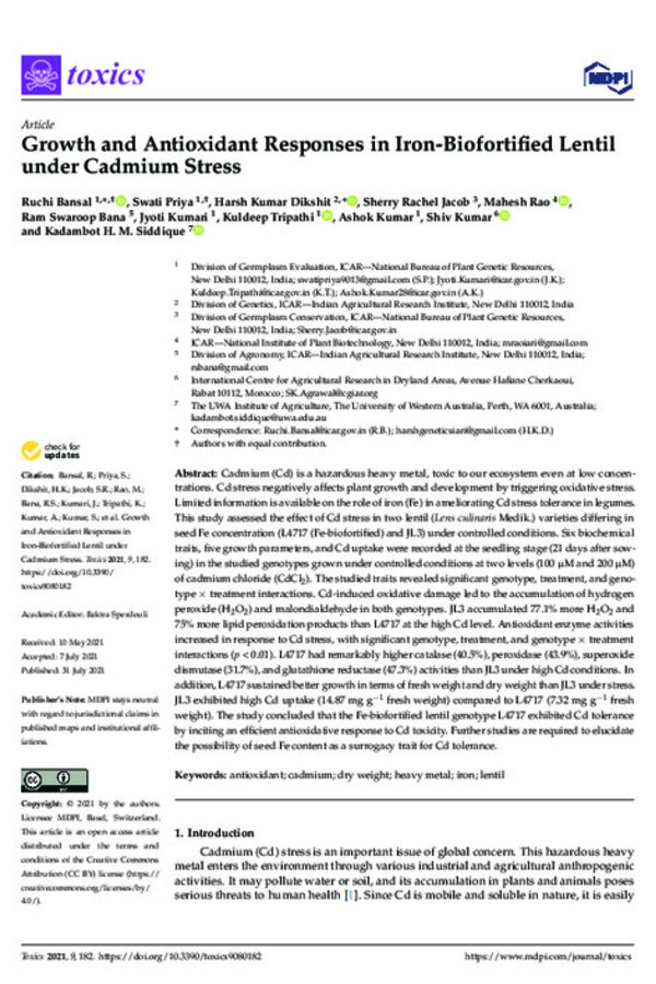 Growth and Antioxidant Responses in Iron-Biofortified Lentil under Cadmium Stress