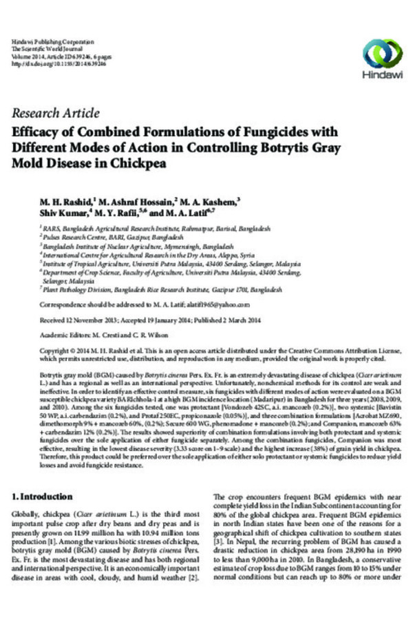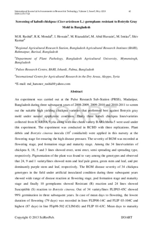 Screening of kabuli chickpea (Cicer arietinum L.) germplasm resistant to Botrytis Gray Mold in Bangladesh