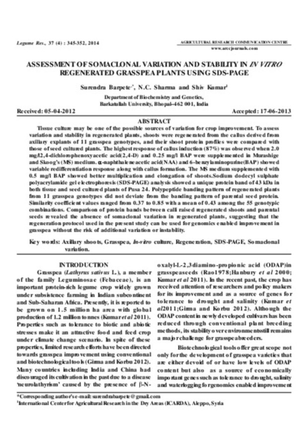 Assessment of somaclonal variation and stability in in vitro regenerated grass pea plants using SDS-PAGE