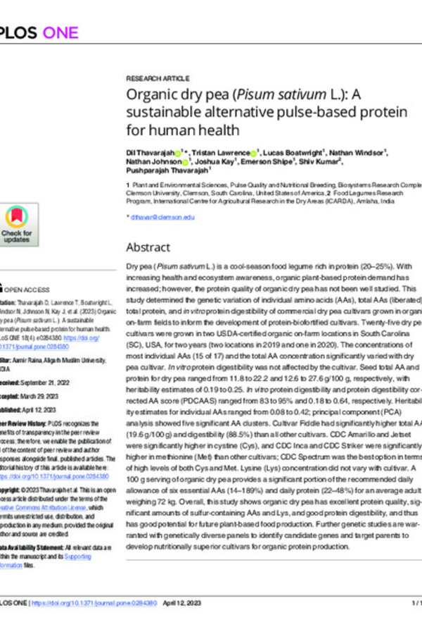 Organic dry pea (Pisum sativum L.): A sustainable alternative pulse-based protein for human health