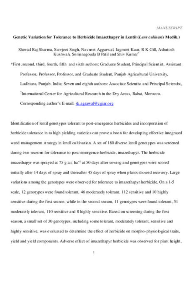 Genetic Variation for Tolerance to Herbicide Imazethapyr in Lentil (Lens culinaris Medik.)
