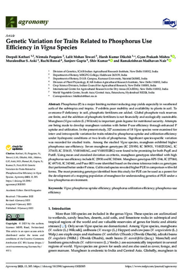 Genetic Variation for Traits Related to Phosphorus Use Efficiency in Vigna Species