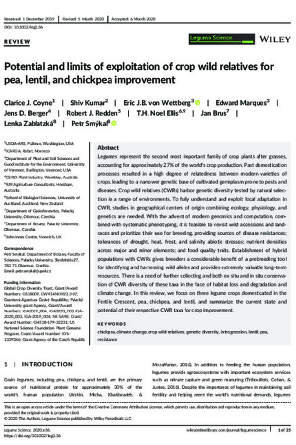 Potential and limits of exploitation of crop wild relatives for pea, lentil, and chickpea improvement