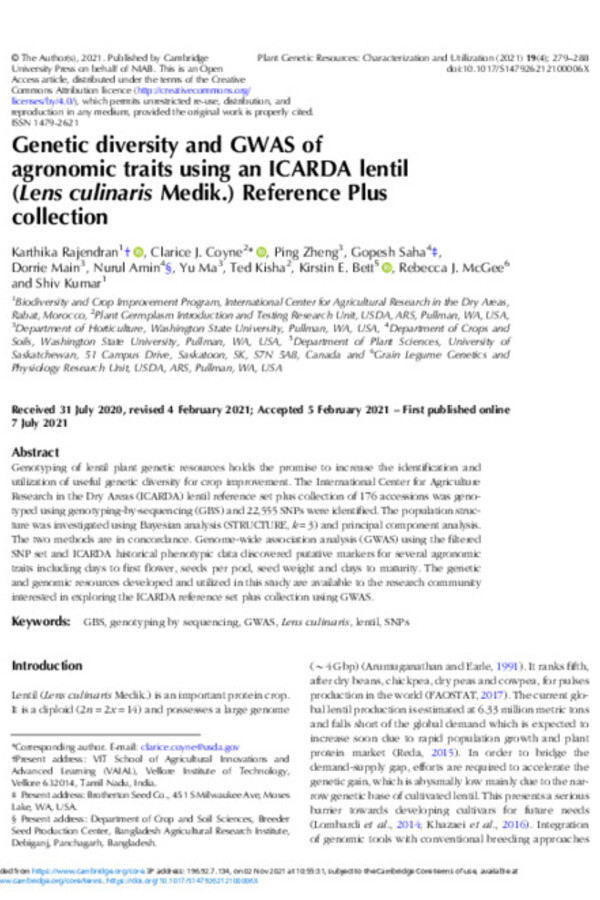 Genetic diversity and GWAS of agronomic traits using an ICARDA lentil (Lens culinaris Medik.) Reference Plus collection