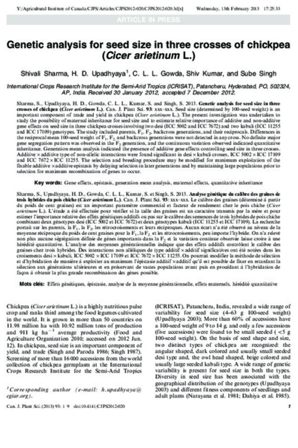 Genetic analysis for seed size in three crosses of chickpea (Cicer arietinum L.)