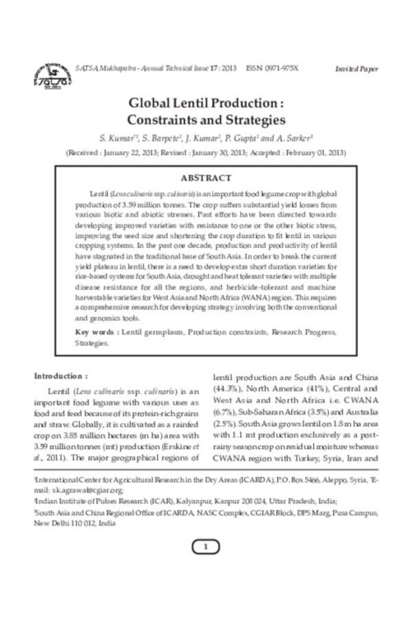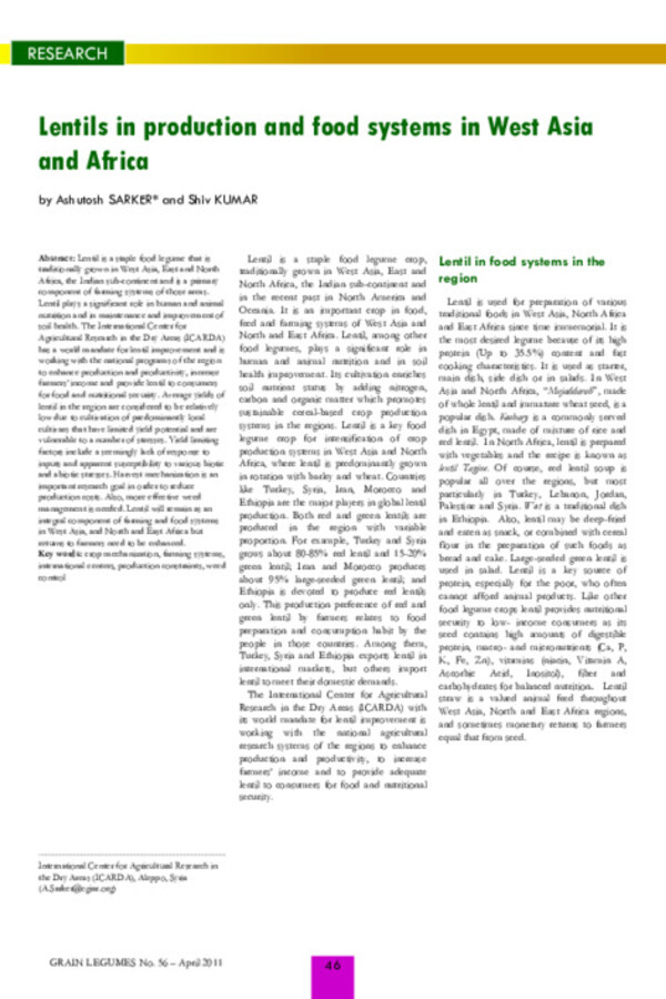 Dr. Shiv Kumar Agrawal is ICARDA’s regional coordinator for South Asia and China and head of the Food Legumes Program, which aims to deliver improved germplasm of lentil, kabuli chickpea, faba bean, and grass pea to national partners in South Asia, sub-Saharan Africa, West Asia, and North Africa. He works on developing short-duration, climate-smart varieties of lentil and grass pea, with high iron and zinc content for the sustainable intensification of cereal-based cropping systems.