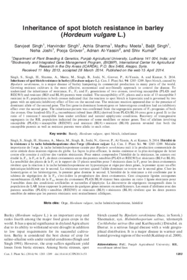 Inheritance of spot blotch resistance in barley (Hordeum vulgare L.)