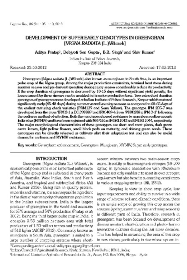 DEVELOPMENT OF SUPER EARLY GENOTYPES IN GREENGRAM [VIGNA RADIATA (L.)Wilczek]