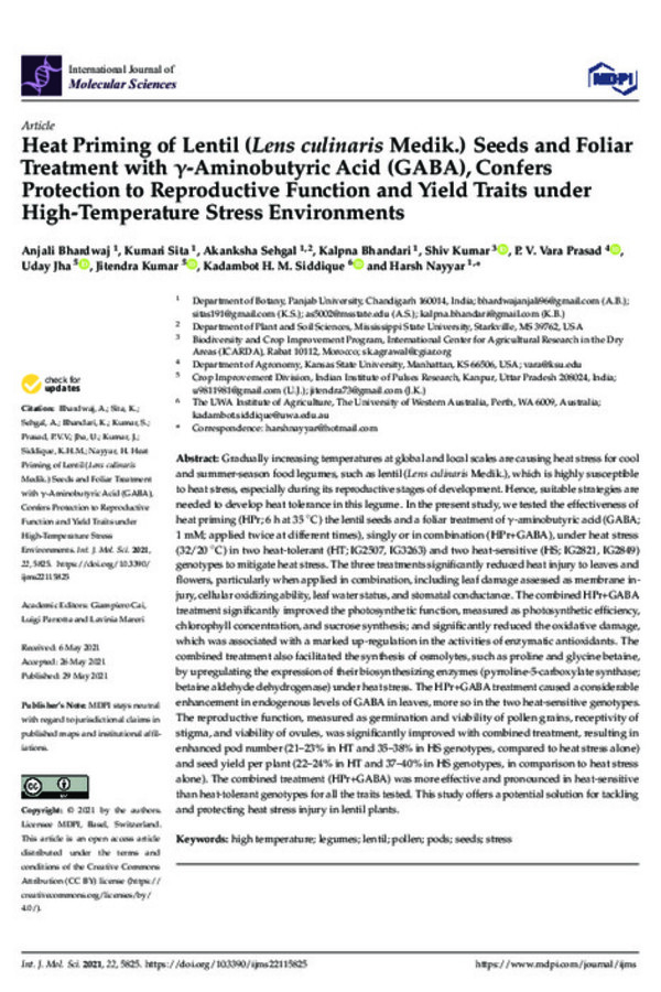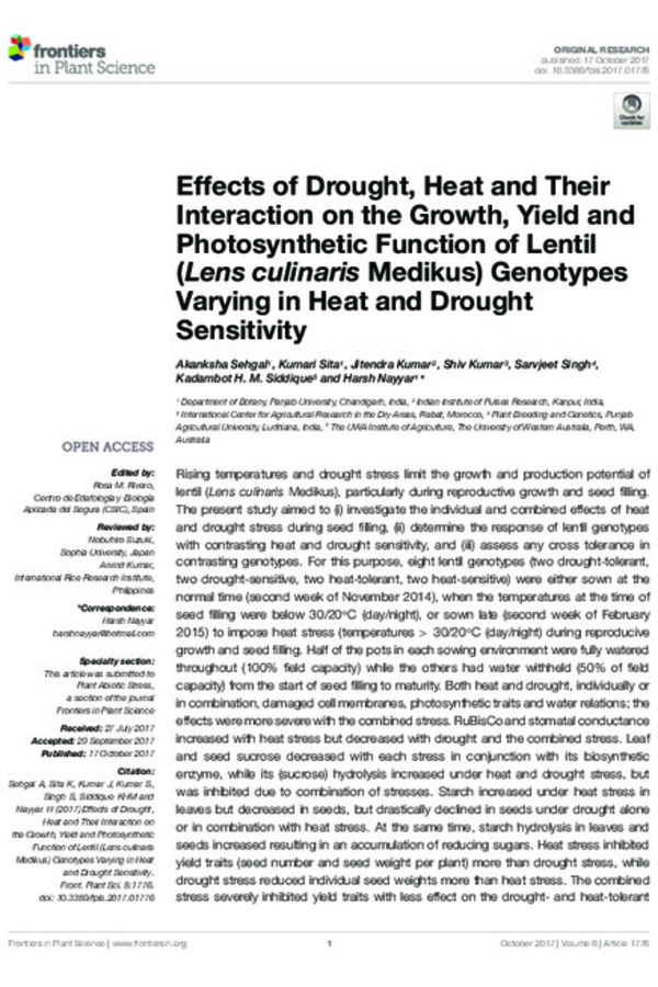 Heat and Drought Stress Impact on Phenology, Grain Yield, and Nutritional Quality of Lentil (Lens culinaris Medikus)