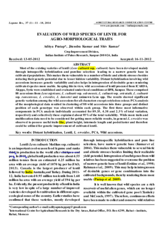 Diversification of indigenous gene- pool by using exotic 5 germplasm in lentil (Lens culinaris Medikus subsp. culinaris)