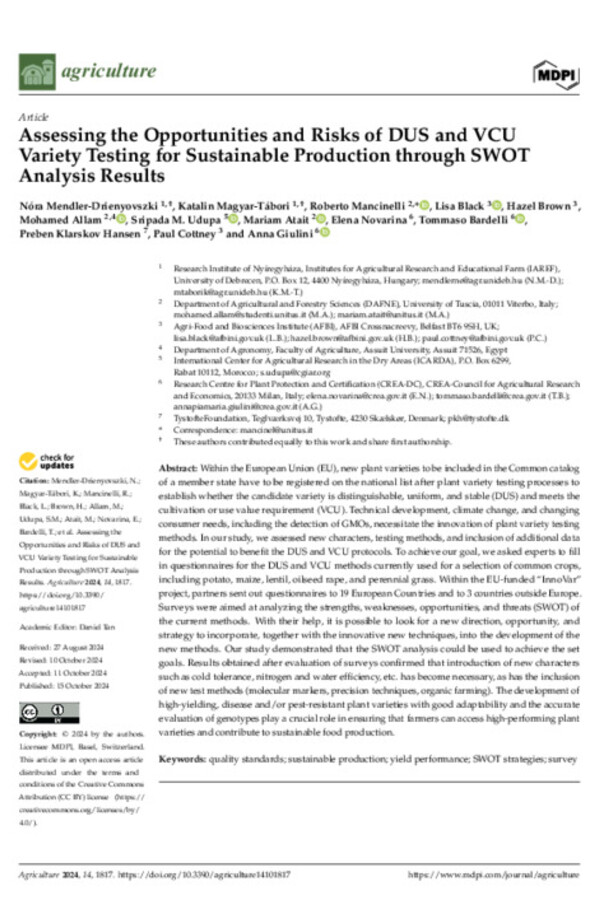 Assessing the Opportunities and Risks of DUS and VCU Variety Testing for Sustainable Production through SWOT Analysis Results