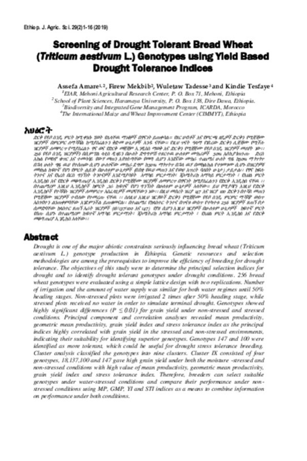 Screening of Drought Tolerant Bread Wheat (Triticum aestivum L.) Genotypes using Yield Based Drought Tolerance Indices