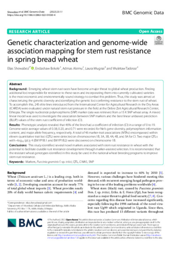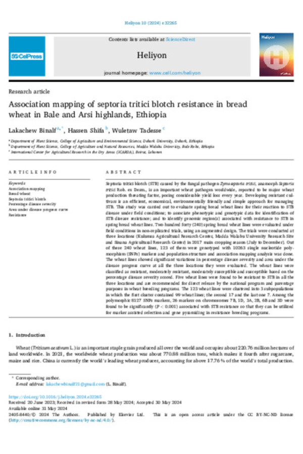 Association mapping of septoria tritici blotch resistance in bread wheat in Bale and Arsi highlands, Ethiopia