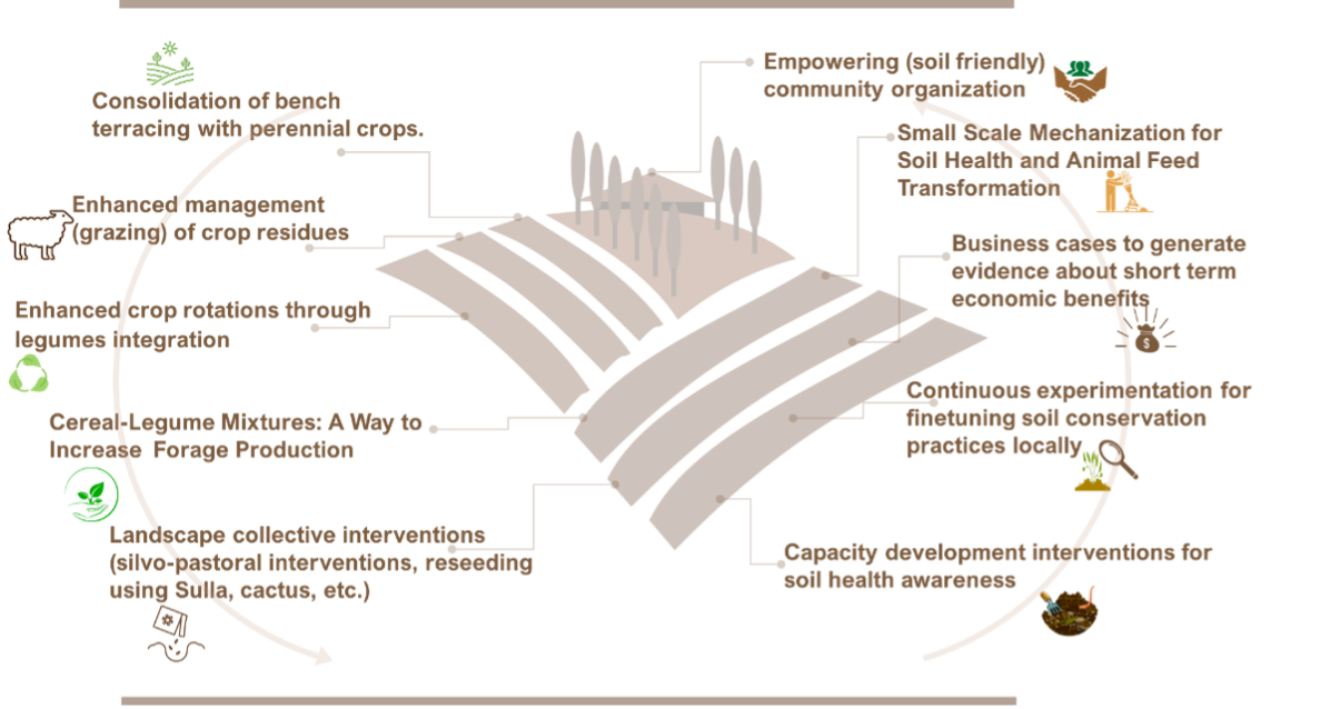 Restoration of soil over wider areas, such as communal land, needs carefully selected land management options specific to the agroecology of the site, requiring in-depth studies to fully understand the site history and what led to its status of degradation. Researchers can then pick integrated packages that include water harvesting techniques, better-managed grazing practices, mechanical and green consolidation of terraces, and planting hardy native rangeland and forage shrubs and grasses such as cactus and Sulla that fix and improve the soil.