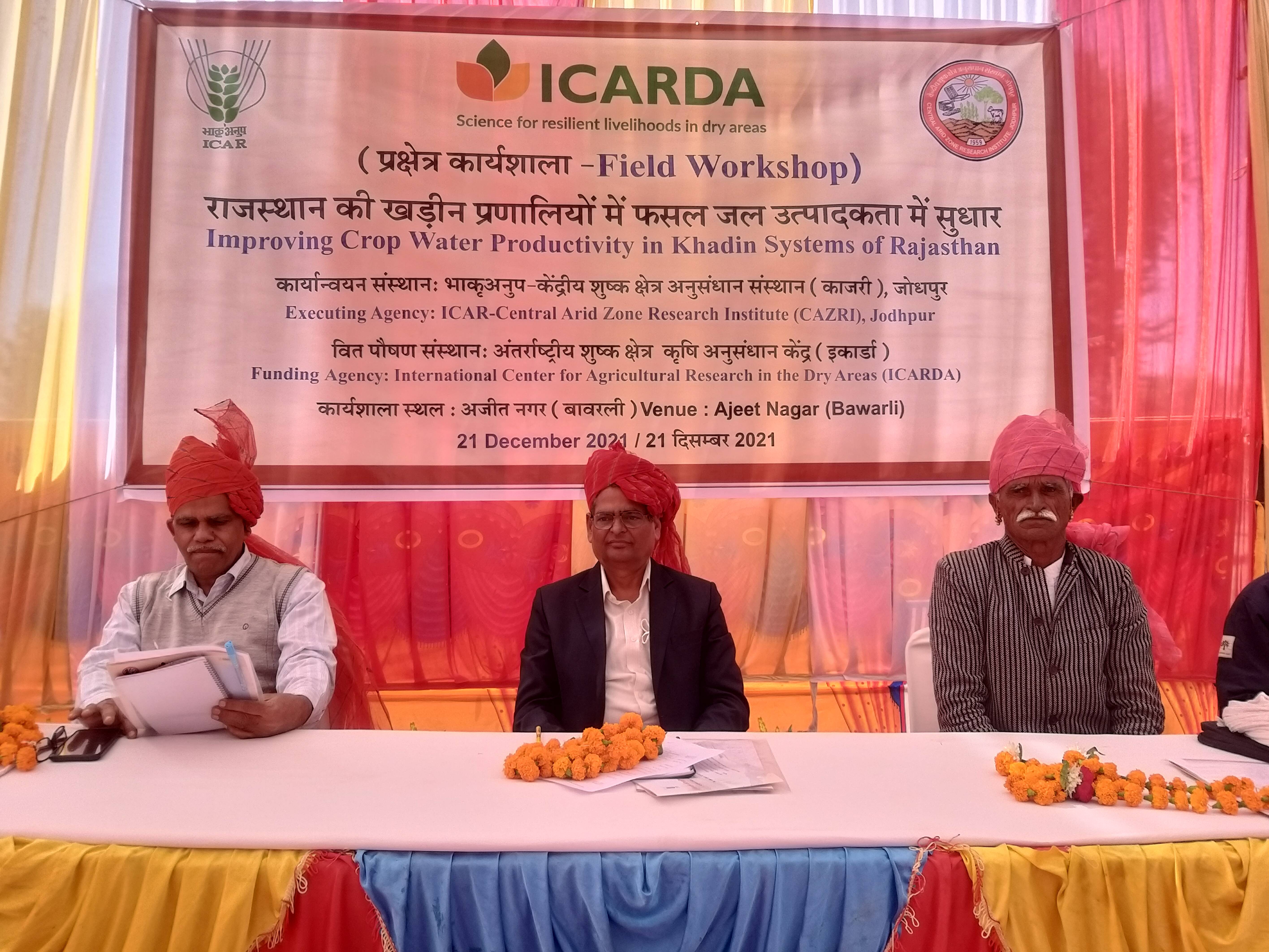 In response, ICARDA, in partnership with the Central Arid Zone Research Institute (CAZRI), with support from the Government of India to the CGIAR, is implementing a project on improving the economic water productivity (income per unit water applied) of the Khadin-based farming systems. The project couples Khadin with a lined rainwater harvesting structure and applies water using farmer-led solar-powered irrigation systems.