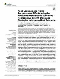 Ambient temperatures are predicted to rise in the future owing to several reasons associated with global climate changes. These temperature increases can result in heat stress- a severe threat to crop production in most countries. Legumes are wellknown for their impact on agricultural sustainability as well as their nutritional and health benefits. Heat stress imposes challenges for legume crops and has deleterious effects on the morphology, physiology, and reproductive growth of plants. High-temperature stress at the time of the reproductive stage is becoming a severe limitation for production of grain legumes as their cultivation expands to warmer environments and temperature variability increases due to climate change. The reproductive period is vital in the life cycle of all plants and is susceptible to high-temperature stress as various metabolic processes are adversely impacted during this phase, which reduces crop yield. Food legumes exposed to high-temperature stress during reproduction show flower abortion, pollen and ovule infertility, impaired fertilization, and reduced seed filling, leading to smaller seeds and poor yields. Through various breeding techniques, heat tolerance in major legumes can be enhanced to improve performance in the field. Omics approaches unravel different mechanisms underlying thermotolerance, which is imperative to understand the processes of molecular responses toward high-temperature stress.
