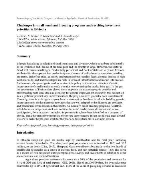 Ethiopia has a large small ruminants population and diversity, which contribute substantially to the livelihood and income of the rural poor and the country at large. However, the sector is faced with various challenges. Productivity per animal and flock off-take are very low. Reasons attributed for the apparent low productivity are: absence of well-planned/appropriate breeding programs, lack of technical capacity, inadequate and poor quality feeds, diseases leading to high lamb mortality, and underdeveloped markets in terms of infrastructure and market information. Furthermore, sheep and goats used to receive little policy or investment attention. Genetic improvement of small ruminants could contribute to reversing the productivity gap. In the past the government of Ethiopia has placed much emphasis on importing exotic genetics and crossbreeding with local stock as a strategy for genetic improvement. However, this has not led to a significant productivity improvement and the programs have generally been unsustainable. Currently, there is a change in approach and a recognition that there is value in building genetic improvement on the local genetic resources that are well adapted to the diverse agro ecologies and production environments in the country. Community-based breeding programs (CBBPs), which focus on indigenous stock and consider farmers’ needs, views, decisions, and active participation, from inception through to implementation, have been identified as a program of choice. The Ethiopian government and the private sector need to invest in strategic areas around CBBPs to make the program work for the poor and sustain in low input system. Keywords: sheep and goat, breeding programs, investment priorities
