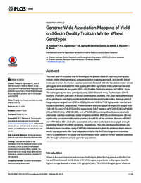 The main goal of this study was to investigate the genetic basis of yield and grain quality traits in winter wheat genotypes using association mapping approach, and identify linked molecular markers for marker assisted selection. A total of 120 elite facultative/winter wheat genotypes were evaluated for yield, quality and other agronomic traits under rain-fed and irrigated conditions for two years (2011-2012) at the Tel Hadya station of ICARDA, Syria. The same genotypes were genotyped using 3,051 Diversity Array Technologies (DArT) markers, of which 1,586 were of known chromosome positions. The grain yield performance of the genotypes was highly significant both in rain-fed and irrigated sites. Average yield of the genotypes ranged from 2295 to 4038 kg/ha and 4268 to 7102 kg/ha under rain-fed and irrigated conditions, respectively. Protein content and alveograph strength (W) ranged from 13.6-16.1% and 217.6-375 Jx10-4, respectively. DArT markers wPt731910 (3B), wPt4680 (4A), wPt3509 (5A), wPt8183 (6B), and wPt0298 (2D) were significantly associated with yield under rain-fed conditions. Under irrigated condition, tPt4125 on chromosome 2B was significantly associated with yield explaining about 13% of the variation. Markers wPt2607 and wPt1482 on 5B were highly associated with protein content and alveograph strength explaining 16 and 14% of the variations, respectively. The elite genotypes have been distributed to many countries using ICARDA's International system for potential direct release and/or use as parents after local adaptation trials by the NARSs of respective countries. The QTLs identified in this study are recommended to be used for marker assisted selection after through validation using bi-parental populations.