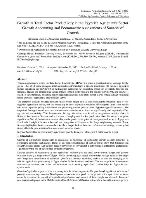 Growth in Total Factor Productivity in the Egyptian Agriculture Sector: Growth Accounting and Econometric Assessments of Sources of Growth