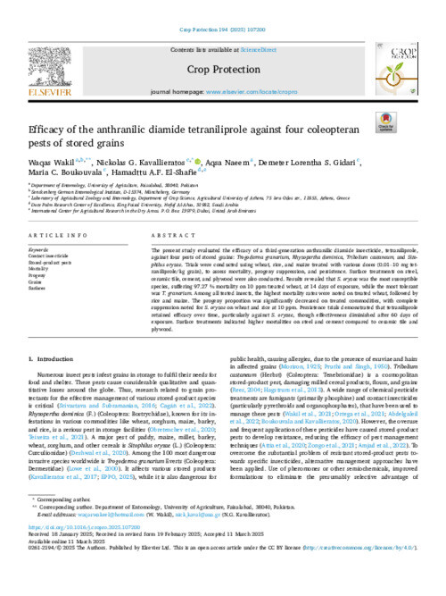 The present study evaluated the efficacy of a third-generation anthranilic diamide insecticide, tetraniliprole, against four pests of stored grains: Trogoderma granarium, Rhyzopertha dominica, Tribolium castaneum, and Sitophilus oryzae. Trials were conducted using wheat, rice, and maize treated with various doses (0.01–10 mg tetraniliprole/kg grain), to assess mortality, progeny suppression, and persistence. Surface treatments on steel, ceramic tile, cement, and plywood were also conducted. Results revealed that S. oryzae was the most susceptible species, suffering 97.27 % mortality on 10 ppm treated wheat, at 14 days of exposure, while the most tolerant was T. granarium. Among all tested insects, the highest mortality rates were noted on treated wheat, followed by rice and maize. The progeny proportion was significantly decreased on treated commodities, with complete suppression noted for S. oryzae on wheat and rice at 10 ppm. Persistence trials demonstrated that tetraniliprole retained efficacy over time, particularly against S. oryzae, though effectiveness diminished after 60 days of exposure. Surface treatments indicated higher mortalities on steel and cement compared to ceramic tile and plywood.