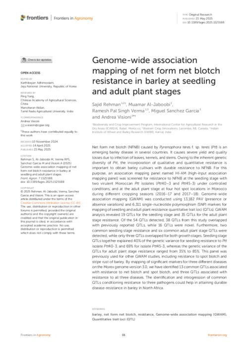 Net form net blotch (NFNB) caused by Pyrenophora teres f. sp. teres (Ptt) is an emerging barley disease in several countries. It causes severe yield and quality losses due to infection of leaves, kernels, and stems. Owing to the inherent genetic diversity of Ptt, the incorporation of qualitative and quantitative resistance is important to obtain barley cultivars with durable resistance to NFNB. For this purpose, an association mapping panel named HI-AM (high-input association mapping panel) was screened for resistance to NFNB at the seedling stage with two virulent Moroccan Ptt isolates (Ptt40–3 and Ptt45-3) under controlled conditions, and at the adult plant stage at four hot spot locations in Morocco during different cropping seasons (2016–17 and 2017–18). Genome-wide association mapping (GWAM) was conducted using 13,182 PAV (presence or absence variations) and 6,311 single-nucleotide polymorphism (SNP) markers for mapping of seedling and adult plant resistance quantitative trait loci (QTLs). GWAM analysis revealed 19 QTLs for the seedling stage and 35 QTLs for the adult plant stage resistance. Of the 54 QTLs detected, 38 QTLs from this study overlapped with previously reported QTLs, while 16 QTLs were novel. Furthermore, two common seedling stage resistance and six common adult plant stage QTLs were detected, while only three QTLs overlapped for both growth stages. Seedling stage QTLs together explained 40% of the genetic variance for seedling resistance to Ptt isolate Ptt40-3, and 69% for isolate Ptt45-3, whereas the genetic variance of the QTLs for adult plant stage resistance ranged from 35% to 85%. This panel was previously used for other GWAM studies, including resistance to spot blotch and stripe rust of barley. By mapping of significant markers for three different diseases on the Morex genome version 3.0, we have identified 13 common QTLs associated with resistance to net blotch and spot blotch, and three QTLs associated with resistance to all three diseases. The identification and introgression of common QTLs conditioning resistance to three pathogens could help in attaining durable disease-resistance in barley in North Africa.