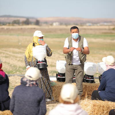 Samia (name has been changed to protect her wish for anonymity) is a Tunisian farmer who received a precision handheld seeder from a female official at the National Agency of Livestock and Pasture (OEP). "The way we used to broadcast seeds was tough work, and it has become easier and faster with the spreader," she says, pointing out that she shares the seeder with other cooperative members.