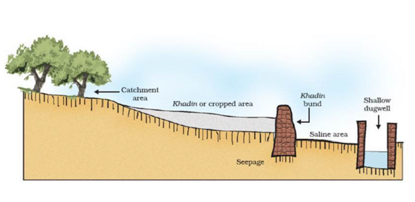 In Rajasthan state in Western India, Khadin is a common rainwater harvesting practice that involves an indigenous in-situ rainwater harvesting system in which bunds are made around fields to stagnate and seep rainwater into the soil and sow marginal crops in the residual moisture.