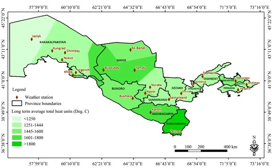 Suppose the heat accumulated daily between April 15 - the optimal planting date for cotton confirmed by this study- and mid-October during harvest is above 1444°C. In that case, the cotton yield is likely to be greater than in all the areas under that level of THU.