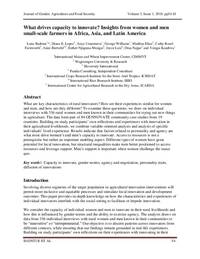 What are key characteristics of rural innovators? How are their experiences similar for women and men, and how are they different? To examine these questions, we draw on individual interviews with 336 rural women and men known in their communities for trying out new things in agriculture. The data form part of 84 GENNOVATE community case studies from 19 countries. Building on study participants’ own reflections and experiences with innovation in their agricultural livelihoods, we combine variable-oriented analysis and analysis of specific individuals’ lived experience. Results indicate that factors related to personality and agency are what most drive women’s and men’s capacity to innovate. Access to resources is not a prerequisite but rather an important enabling aspect. Different types of women have great potential for local innovation, but structural inequalities make men better positioned to access resources and leverage support. Men’s support is important when women challenge the status quo.